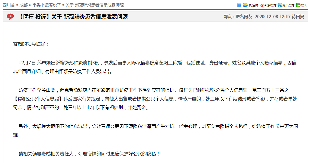 对此,有网友通过四川在线·问政四川和川观新闻·民情热线(028-86968696)留言,认为“对该患者进行诋毁、辱骂,以及恶意揣测该患者职业,患者个人隐私信息的泄露无疑将对当事人当前及今后生活造成巨大的困扰。恳请有关部门加强对公民隐私的保护及有关工作宣传力度,同时对泄露公民隐私者不姑息迁就,依法追责。”