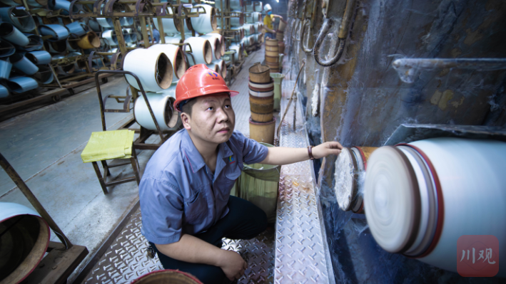 朱军在检查玻璃纤维拉丝机。陈宇 摄