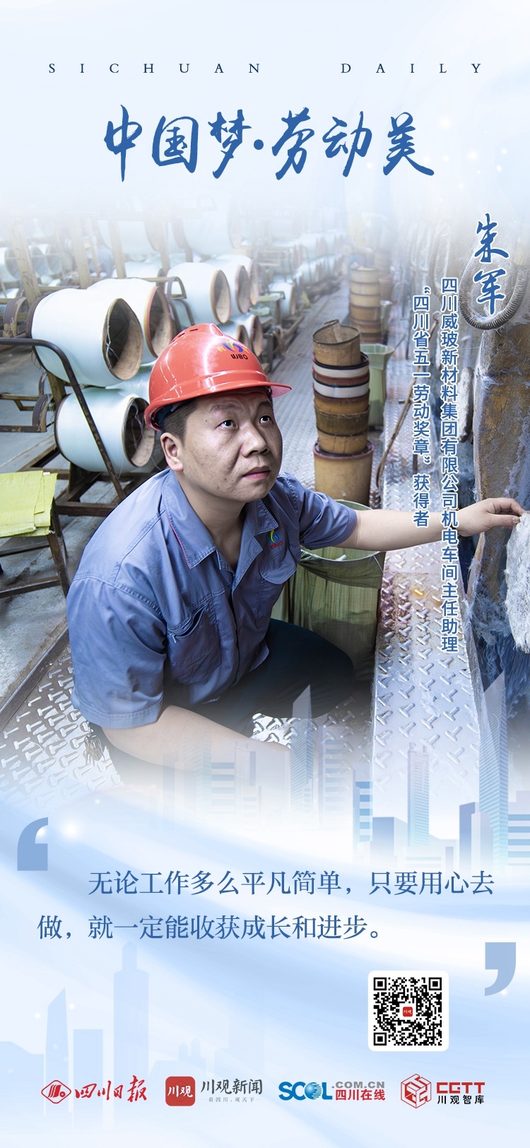 朱军,四川威玻新材料集团有限公司机电车间主任助理。四川省五一劳动奖章获得者。朱军在日常工作中一直专注于老旧设备升级换代,参与公司机械设备改造,带领团队先后自主研发设计了“恒压供水系统”等3项自主创新项目,为企业减少能耗、节约成本、提升工作效率等作出了突出贡献,其所在班组荣获2021年四川省职工“五小”活动先进班组。