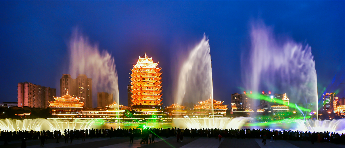 音乐喷泉设计精致巧妙、规格高雅、散发着浓浓东坡文化馨香,呈现独具眉山文化特色的音乐水舞景观。