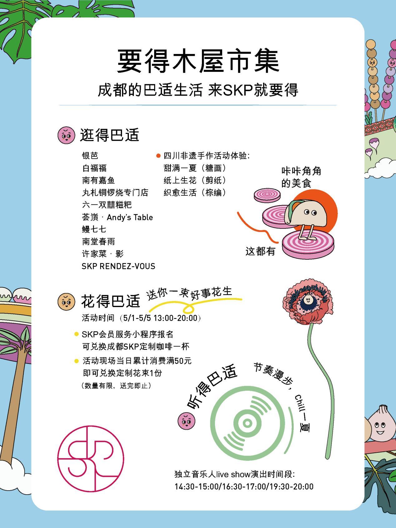 “吃”川味美食,“喝”成都SKP定制咖啡。成都SKP将于“美食大道1F”打造特色川菜品鉴市集——“‘要得’木屋市集”,会员可以通过成都SKP小程序报名参与,免费兑换SKP定制咖啡1杯、现场累计消费50元兑换花礼1份,体验安逸巴适的成都生活。