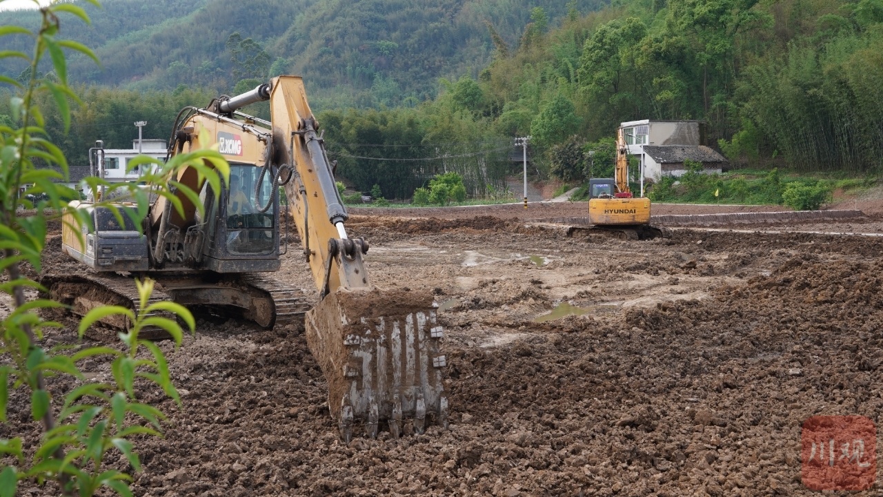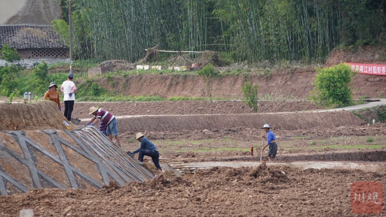 近日,在宜宾江安县红桥镇两江村稻虾循环养殖基地施工现场,机械轰鸣、一派繁忙,工人们正在对田埂边坡进行平整维护,几台挖掘机来回作业,挖掘填平。经过边坡改造、清理淤泥、进排水系统、生产道路建设等施工,循环养殖基地建设已经初具规模。