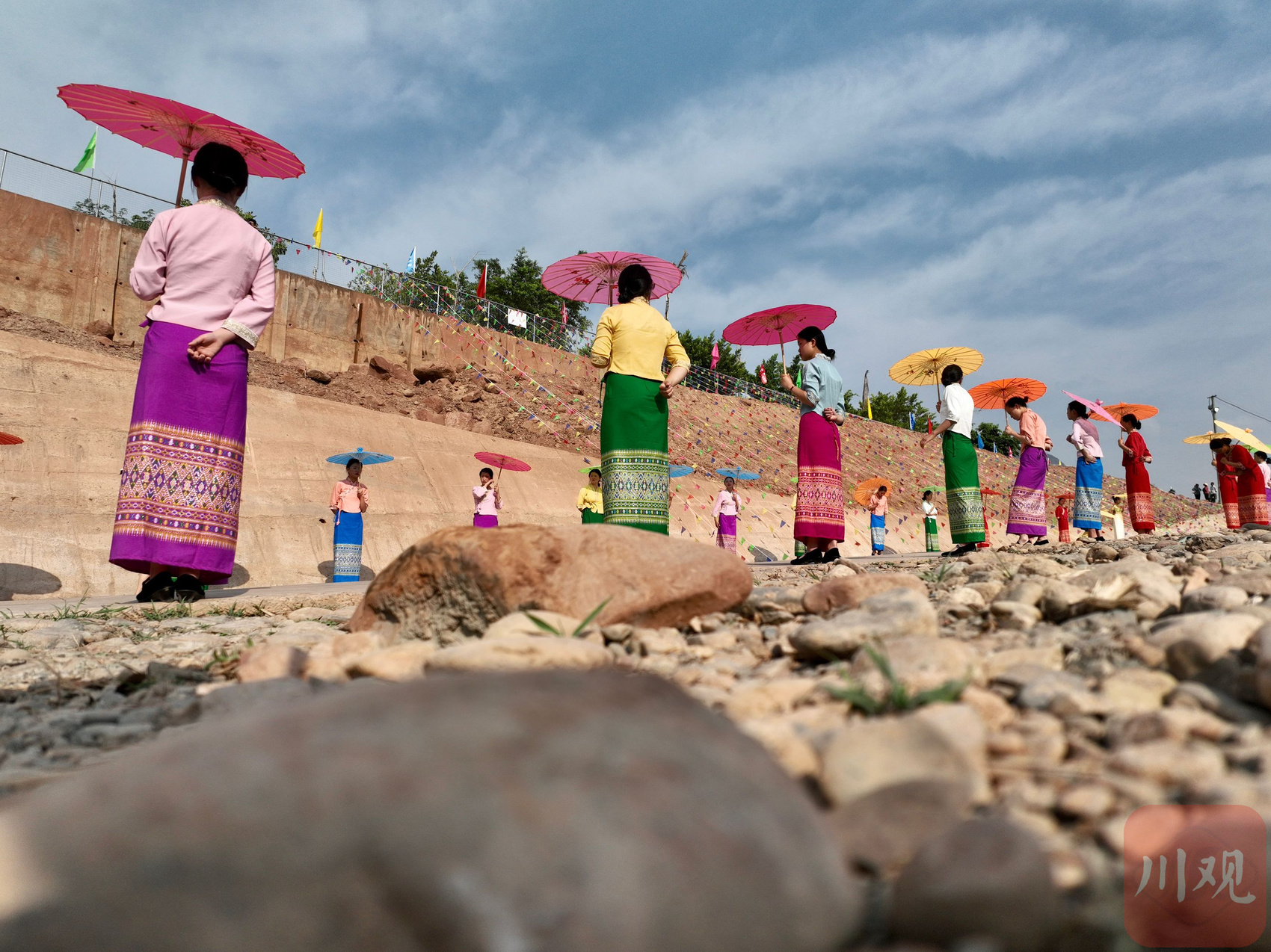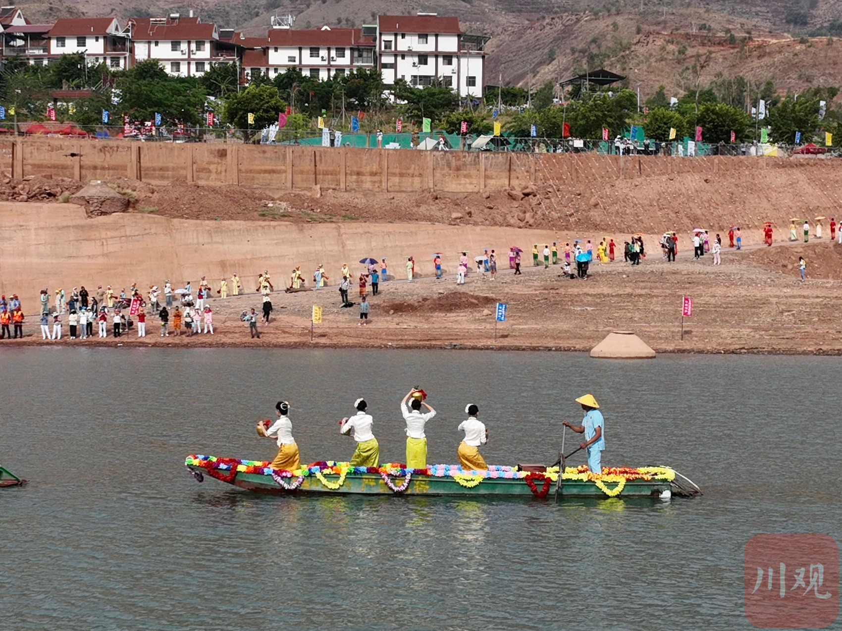 两艘鲜花妆点的船只从江面上缓缓驶来……这是泼水狂欢前的取水和祭祀仪式。4月29日,凉山州首届乡村文化旅游节(春季)暨会理傣乡泼水节在会理市新安傣族乡马鞍桥村举行。在傣族特色乐器象脚鼓、铓锣的演奏声中,身着盛装的傣族儿女们和上万各族群众齐聚泼水广场,欢度傣历1386年新年节。
