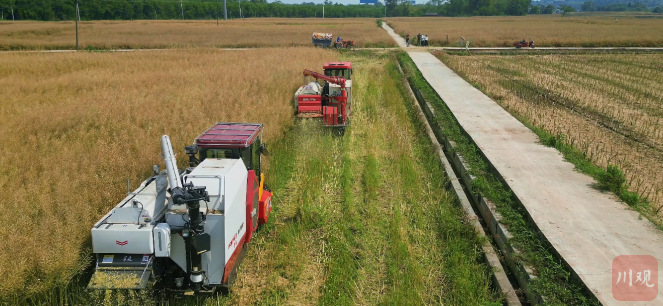 在仁寿越友种植专业合作社的600亩油菜种植基地,成片的油菜已经成熟,沉甸甸的油菜籽压弯了枝头。两台收割机在田间往来穿梭,伴随着隆隆的作业声,一排排油菜被卷入机器,自动脱粒之后,油菜果壳和油菜秆则被碾成碎片,抛撒还田,育肥地力,而收割好的油菜籽则被送往烘干中心进行烘干。