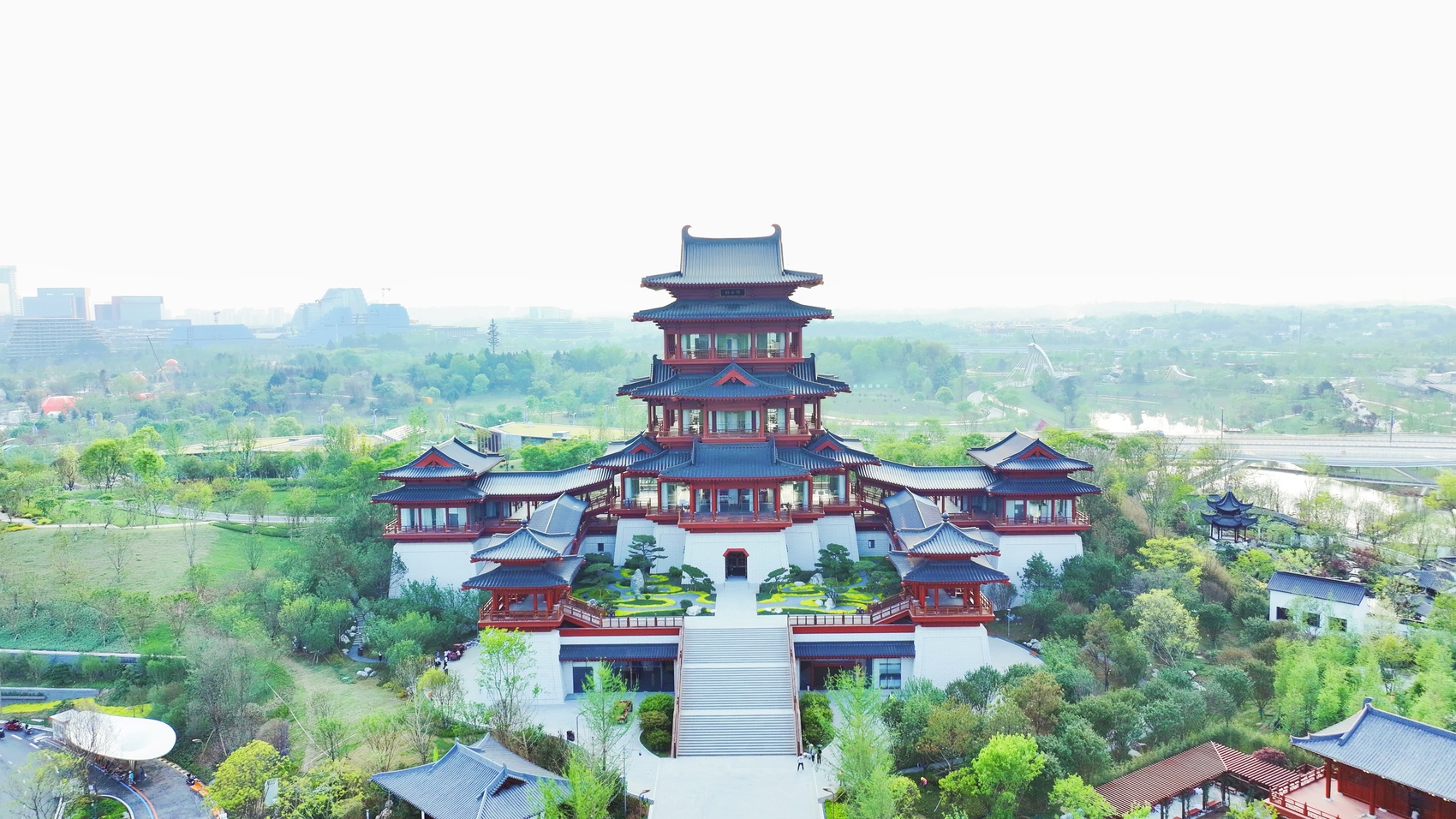 这大概是最有仪式感的登楼览胜,登斯楼也,凭栏远眺,游人不由地吟诵李白的《登锦城散花楼》,“日照锦城头,朝光散花楼……今来一登望,如上九天游。”于是唐朝的风,穿越千年,带来问候。眼前的建筑,正以此诗为据,借鉴唐代楼阁风貌而建。屋面出檐、翼角起翘、平座斗拱,地面五层楼阁伫立于高台之上,各层四面分别设置宽大门廊和歇山抱厦(在建筑之前或之后接建出来的配楼)。