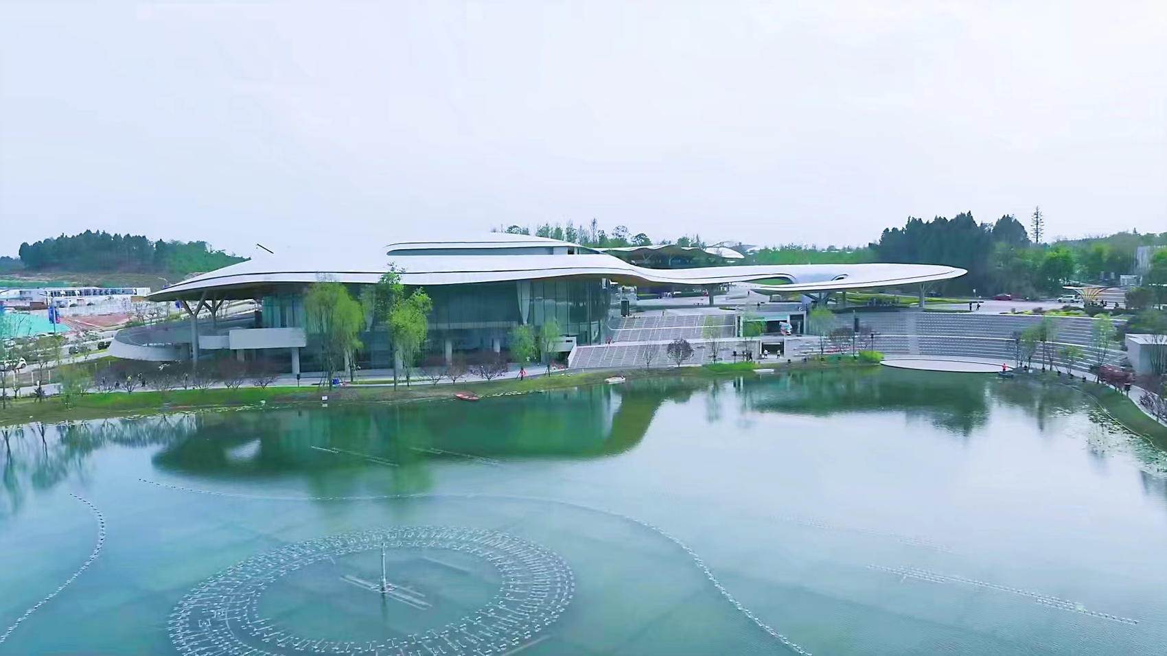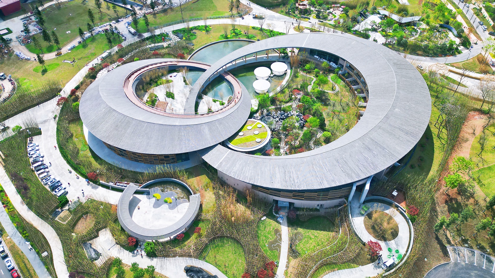 客从“花”中来,进入主展馆的户外空间,绛霞湖向游客张开怀抱。从高空俯瞰,主场馆如神鸟衔花飞至绛霞湖畔。