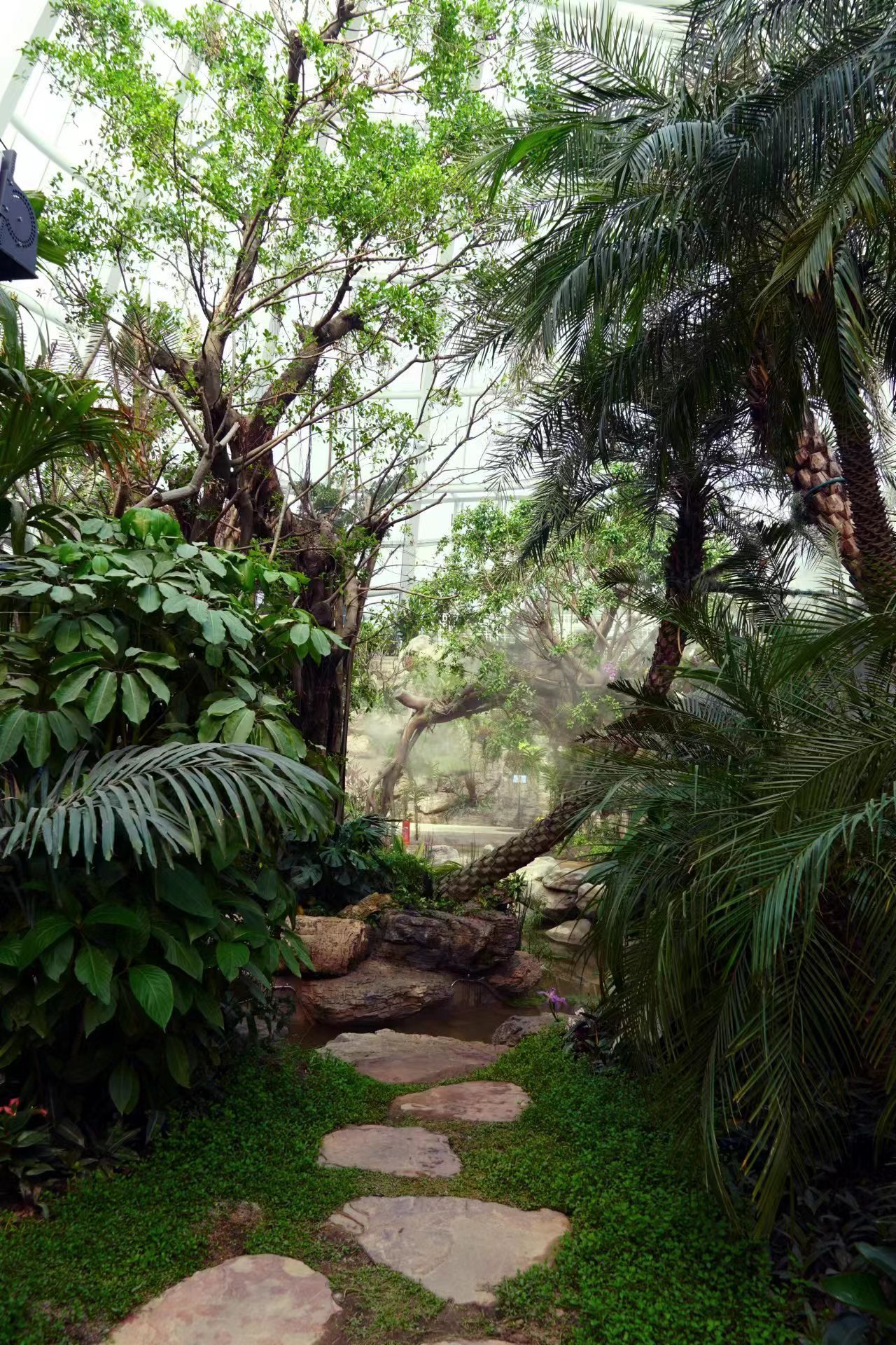 植物馆内部,3个篮球场大小的面积,微缩了辽阔的热带雨林景观,“孵化”了近200种珍稀植物,无异于螺蛳壳里做道场。其中模拟了热带雨林中的幽静小溪、飞泻瀑布、参天大树、缠绕藤萝、繁茂花草、交织花廊等特色景观,游人走在迂回曲折的游览径道,身旁从生活在恐龙时代的蕨类桫椤,到生长在现代的睡莲,品种繁多的各类植物跨越山川湖海,在这个“人造”的奇妙植物王国展露芳华。