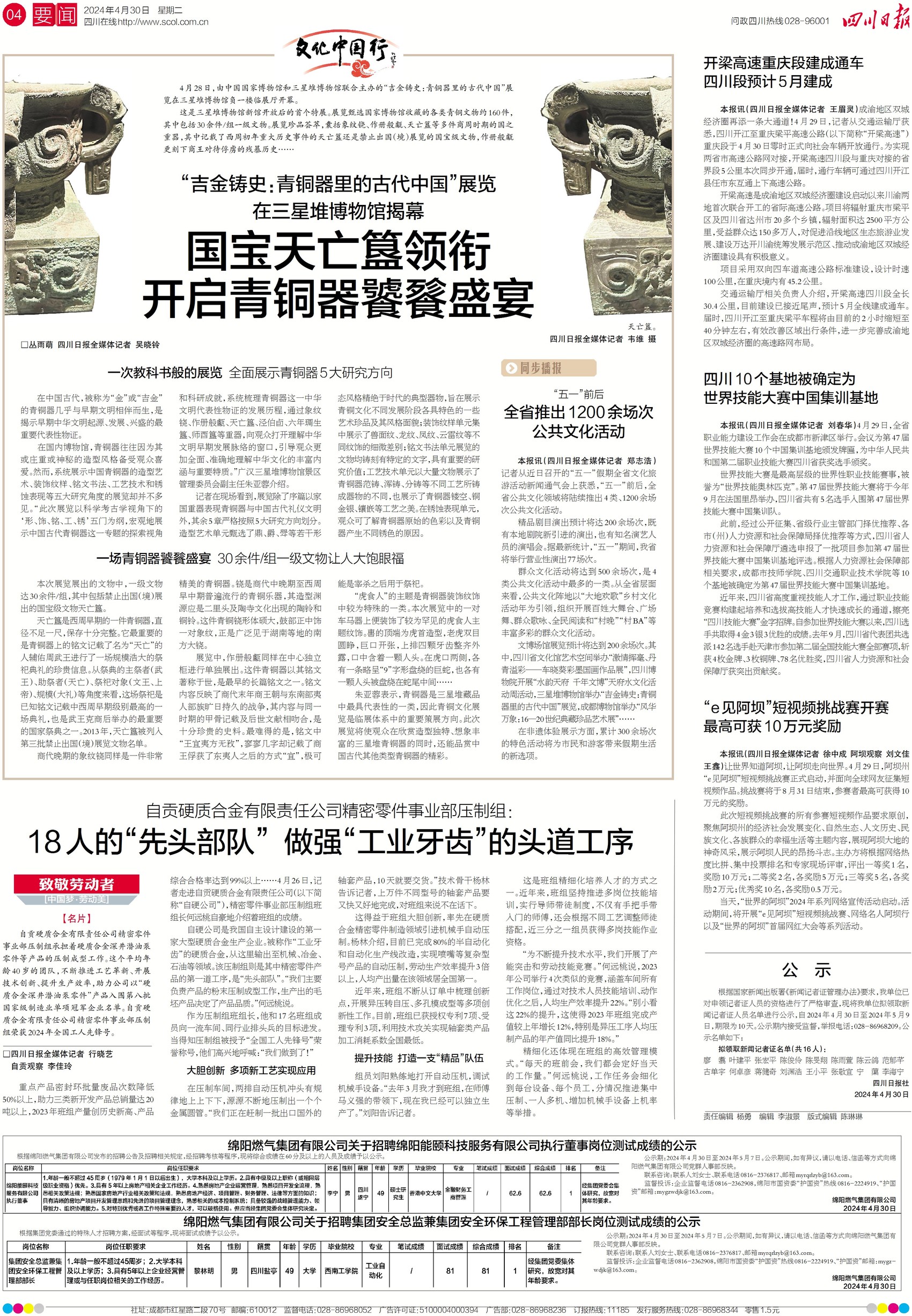4月28日,由国博和三星堆博物馆联合主办的“吉金铸史:青铜器里的古代中国”展览在三星堆博物馆开幕。展览集聚了30余件一级文物,包括象纹铙、作册般甗等“国之重器”,更有禁止出国(境)展览的国宝级文物“天亡簋”,堪称一场教科书式的展览。关注今日4版,了解“天亡簋”背后的惊人故事。“五一”来临,赶紧约起!
