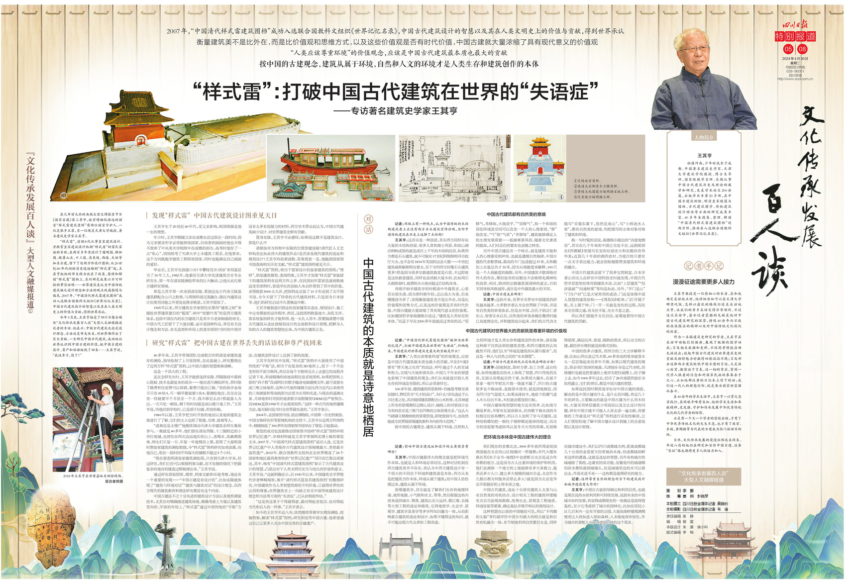 四川日报全媒体“文化传承发展百人谈”大型人文融媒报道持续推出,今日《四川日报》连版推出第三十一期,专访著名建筑史学家王其亨。故宫、颐和园、清西陵……这些我们耳熟能详的古建筑,形态各异,有无“套路”可循?王其亨潜心研究中国古代建筑四十多年,帮助中国古代建筑找回了在世界上丢失的话语权。他表示,中国古代建筑无论是设计理念、方法还是审美体系,对世界都作出了巨大贡献。一生研究中国古代建筑,成功地让世界认识到中国古建的价值,把中国古建的设计、尊严和话语权找了回来……王其亨说“我这辈子值了!”