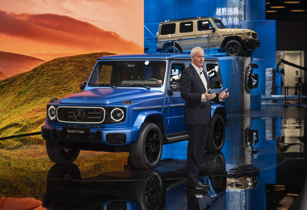 4月25日,在北京中国国际展览中心顺义馆举行的2024北京车展上,梅赛德斯—奔驰集团股份公司董事会成员唐仕凯介绍梅赛德斯—奔驰纯电G级越野车。新华社记者才扬摄