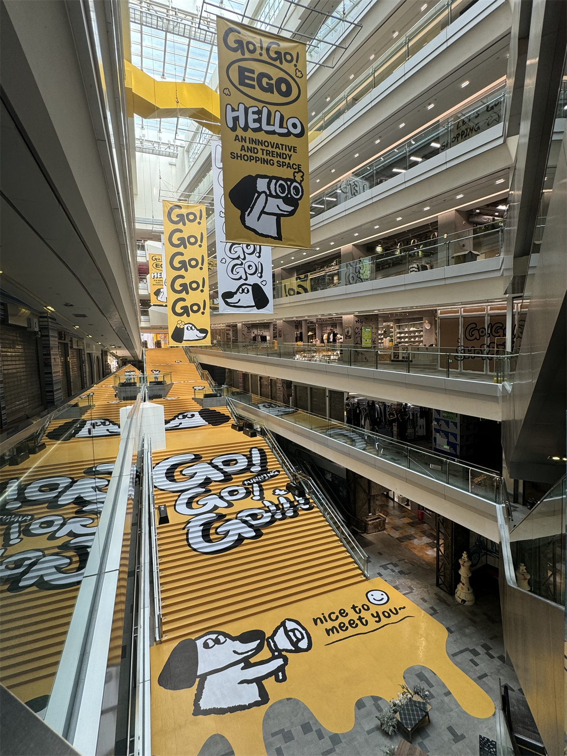 在春熙路商圈西侧南边,成都EGO潮流广场即将焕新归来。记者在现场看到,明黄色的“GOGO EGO”LOGO在焕然一新的建筑外墙上格外醒目,走进场内,由大面积明黄色、独具个性的宠物IP形象构成的5层楼装潢形成强有力的视觉冲击。
