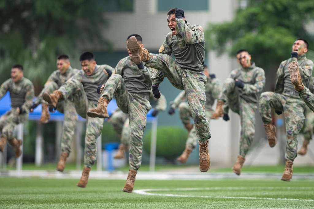 4月30日,中国人民解放军驻澳门部队官兵进行军事训练课目展示。
