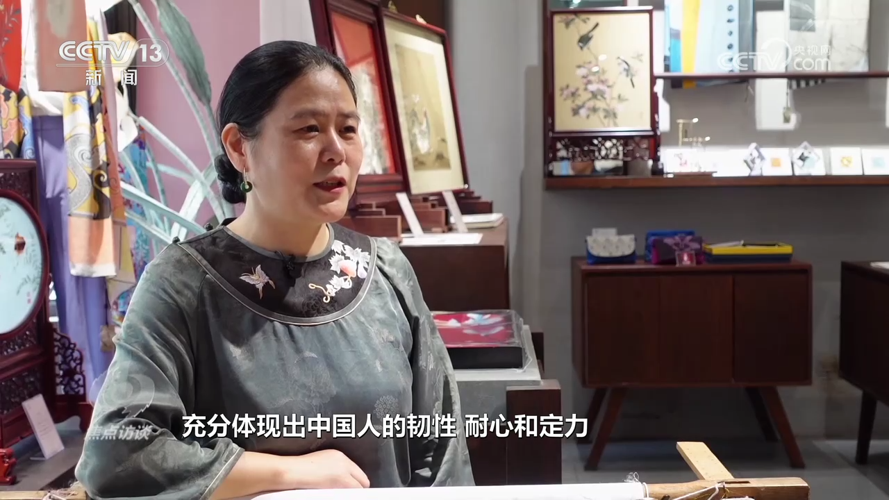 卢建英:“当时我在绣一幅《桃花太平鸟图》,习近平总书记走到了我的绷架前。他说你好,很亲切,很和蔼,看得非常仔细。他说中华文化的传承力有多强,通过这个苏绣可以看出来,像这样的功夫充分体现出中国人的韧性、耐心和定力,这是中华民族精神的一部分,能得到总书记的认可,真的是倍感荣耀。”