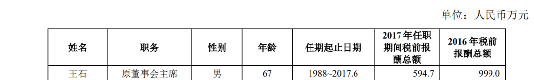 此外,王石2016年度税前薪酬总额为999万元,2017年1月至6月的税前薪酬总额为594.7万,或可推测其全年薪酬总额约为1190万元。