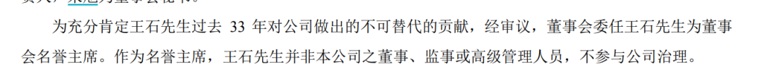 当年年报显示,为充分肯定王石过去33年对公司做出的不可替代的贡献,经审议,董事会委任王石为董事会名誉主席。作为名誉主席,王石并非本公司之董事、监事或高级管理人员,不参与公司治理。