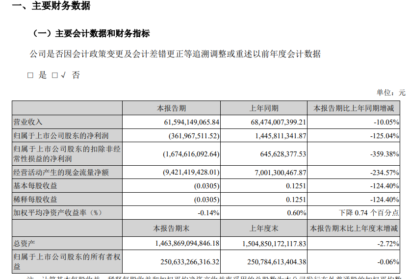 万科最新财报显示,2024年第一季度营业收入615.94亿元,同比下降10.05%,净亏损3.62亿元,去年同期净利润14.46亿元。