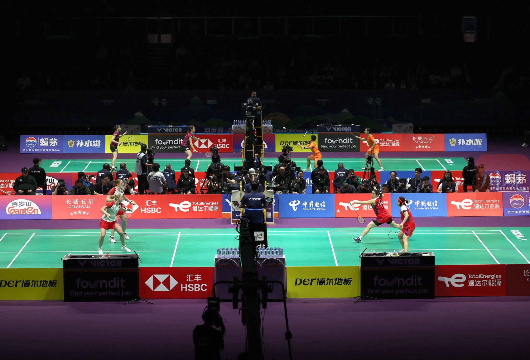 中国队(画面红衣)陈清晨(右一)/贾一凡在女双比赛中