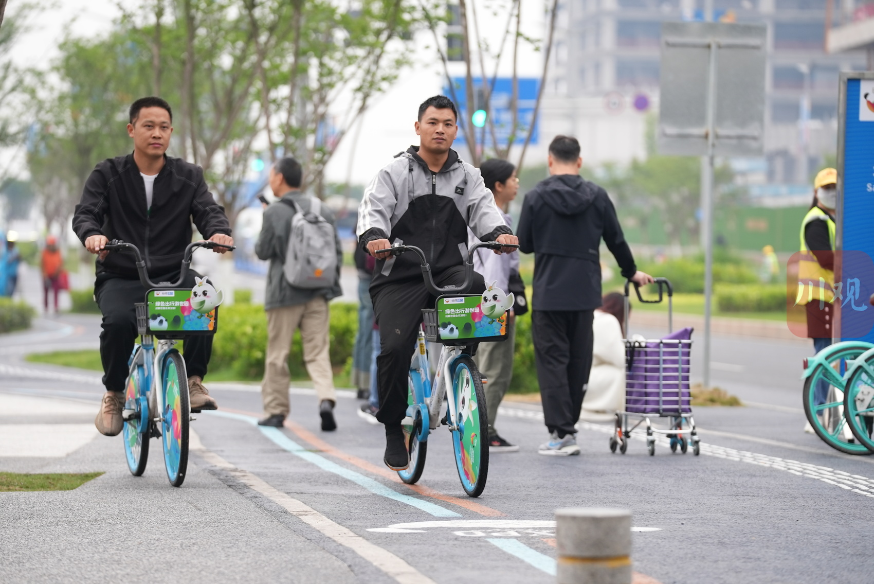 三岔站附近有市民游客选择绿色出行,骑共享单车前往世园会主会场