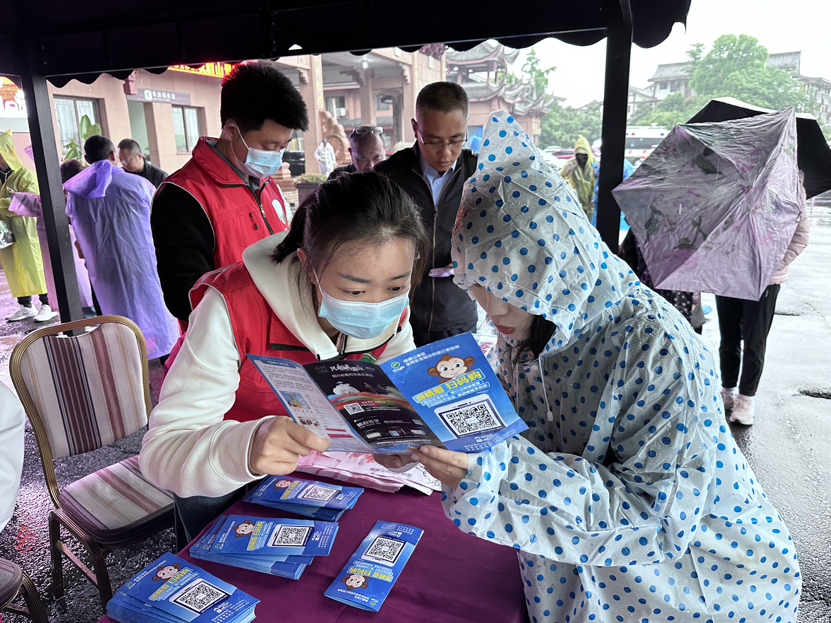 “请游客注意脚下,雨天小心滑倒。”“免费雨衣、口罩、纸巾……请有需要的游客在此领取。”5月2日凌晨五点,峨眉山黄湾游客中心停车场的志愿服务点,峨眉山旅游股份有限公司“小红衫”工作人员陈亚飞便在此迎接游客,相比以往,他的上班时间提前了一个多小时,以应对假期游客高峰的到来。