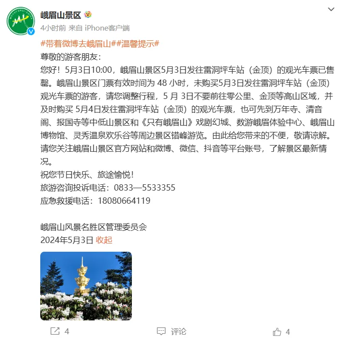 5月3日发往雷洞坪车站(金顶)的观光车票已售罄,未购买5月3日发往雷洞坪车站(金顶)观光车票的游客,请调整行程。