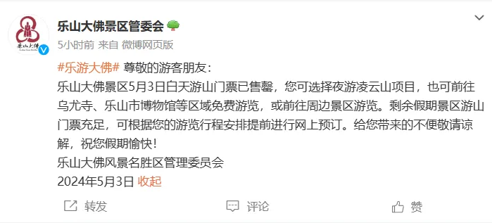 5月3日白天游山门票已售罄,游客可选择夜游凌云山项目,也可前往乌尤寺、乐山市博物馆等区域免费游览,或前往周边景区游览。
