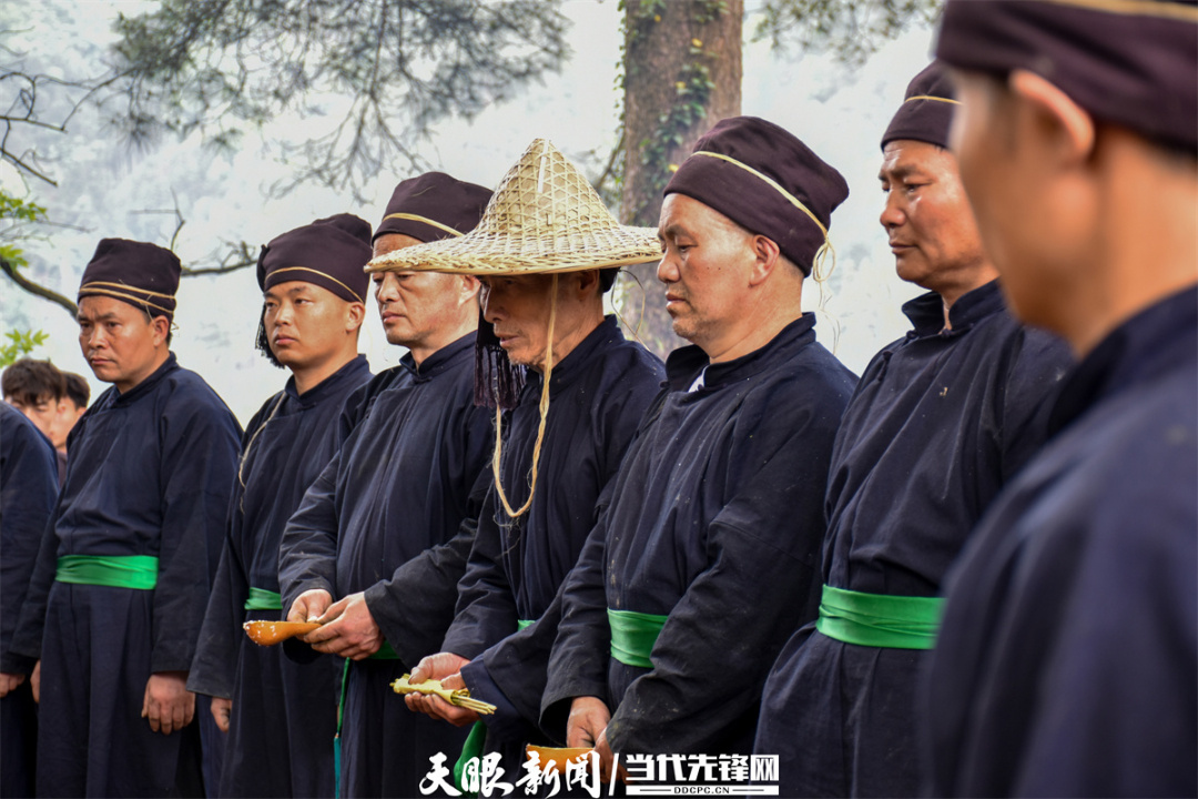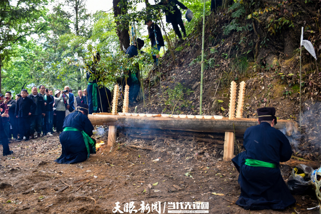 随后,大家沿着规定路线返回村中,在沿途的坡上插上白纸幡,并带回沿途山坡上的泥土,大家回到村里的祭祀坛后,在此又进行系列的仪式,而后大家又带着祭品到自家房族祭坛上再次祭祀,到此代表着整个仪式圆满完成。仪式的完成代表着本届鼓藏节正式开始。