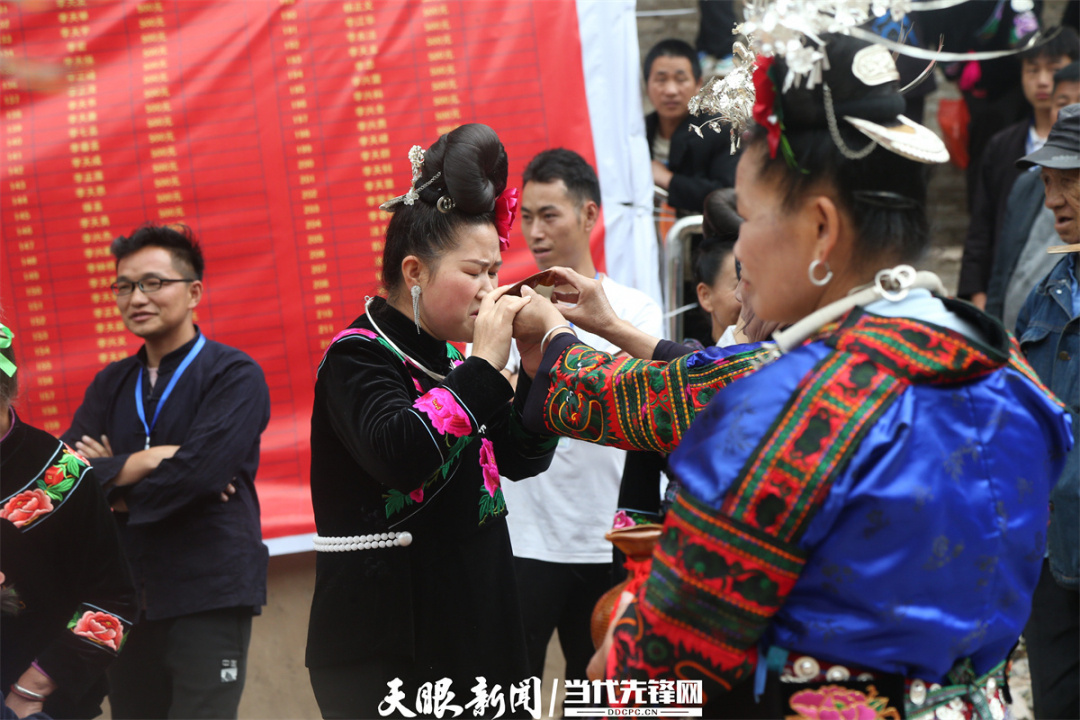 鼓藏节的最后一天,在朗利苗寨鼓藏场上,单身男女青年身着民族服饰,寻求意中人,开始了“讨花带”活动。