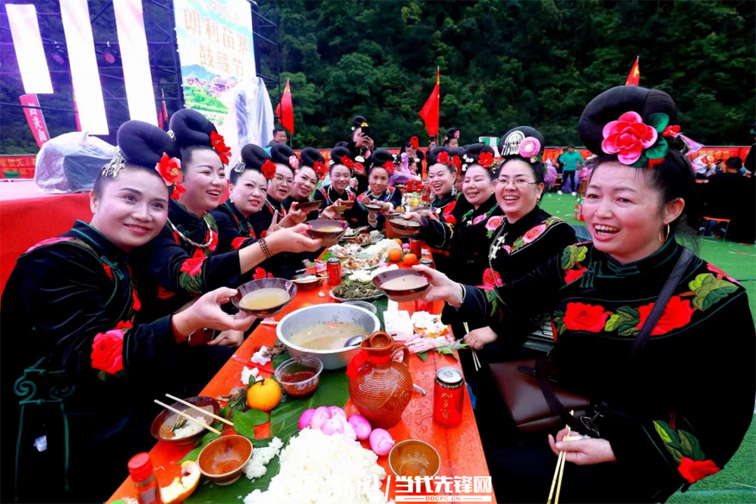 鼓藏节期间,村民在朗利苗寨的寨门口摆设了12道拦门酒和“高山流水”敬酒,迎接八方亲友。