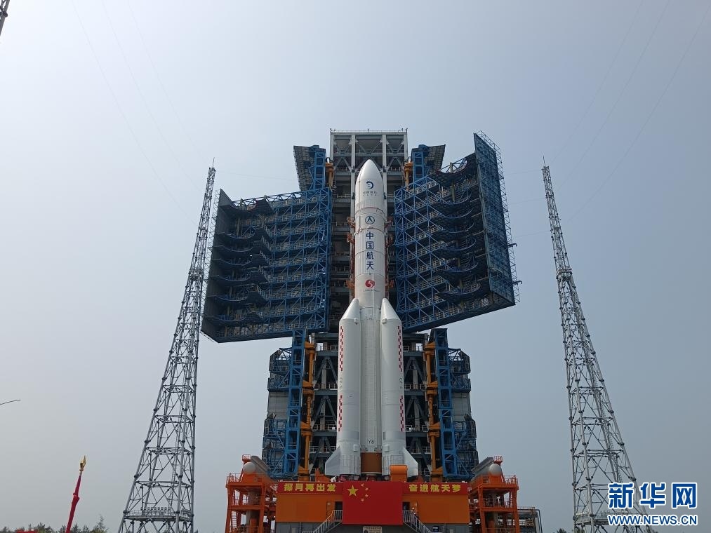 4月27日,嫦娥六号探测器和长征五号遥八运载火箭器箭组合体垂直转运至发射区。新华社发(黄国畅 摄)