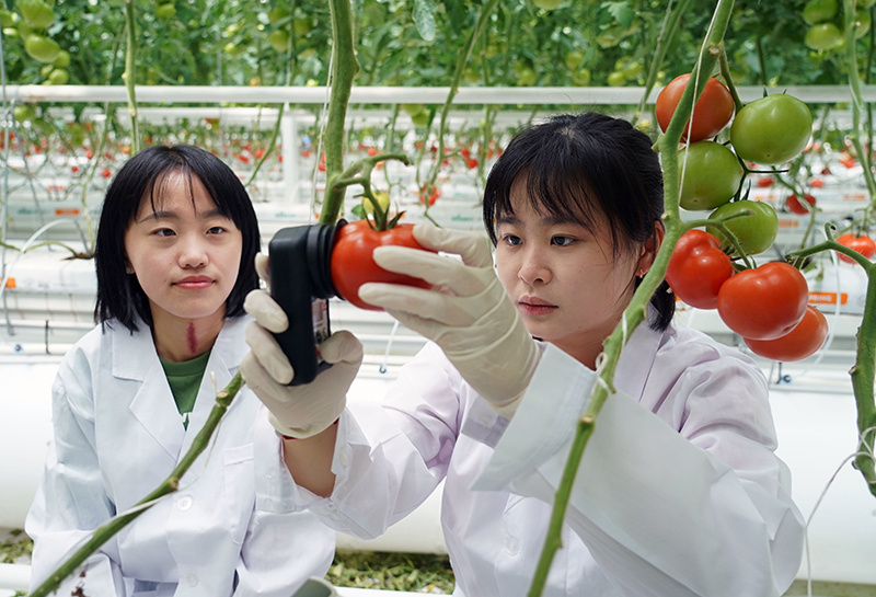 2023年5月28日,北京市平谷区峪口镇西樊各庄村科技小院驻村大学生在京瓦温室园艺示范园测量番茄果实硬度。