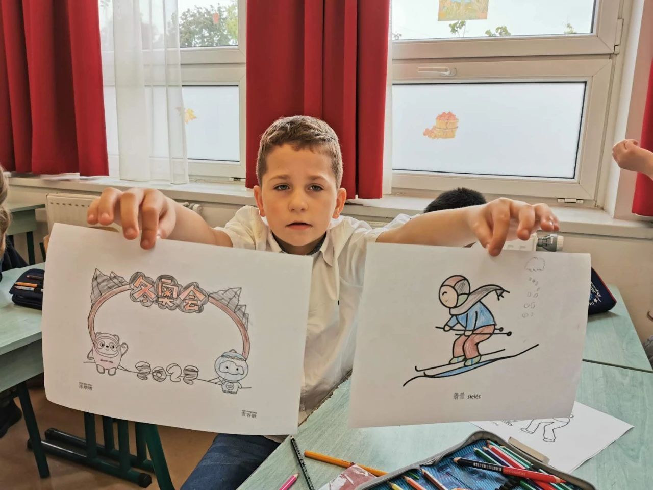 匈中双语学校学生展示具有冬奥元素的填图画 。