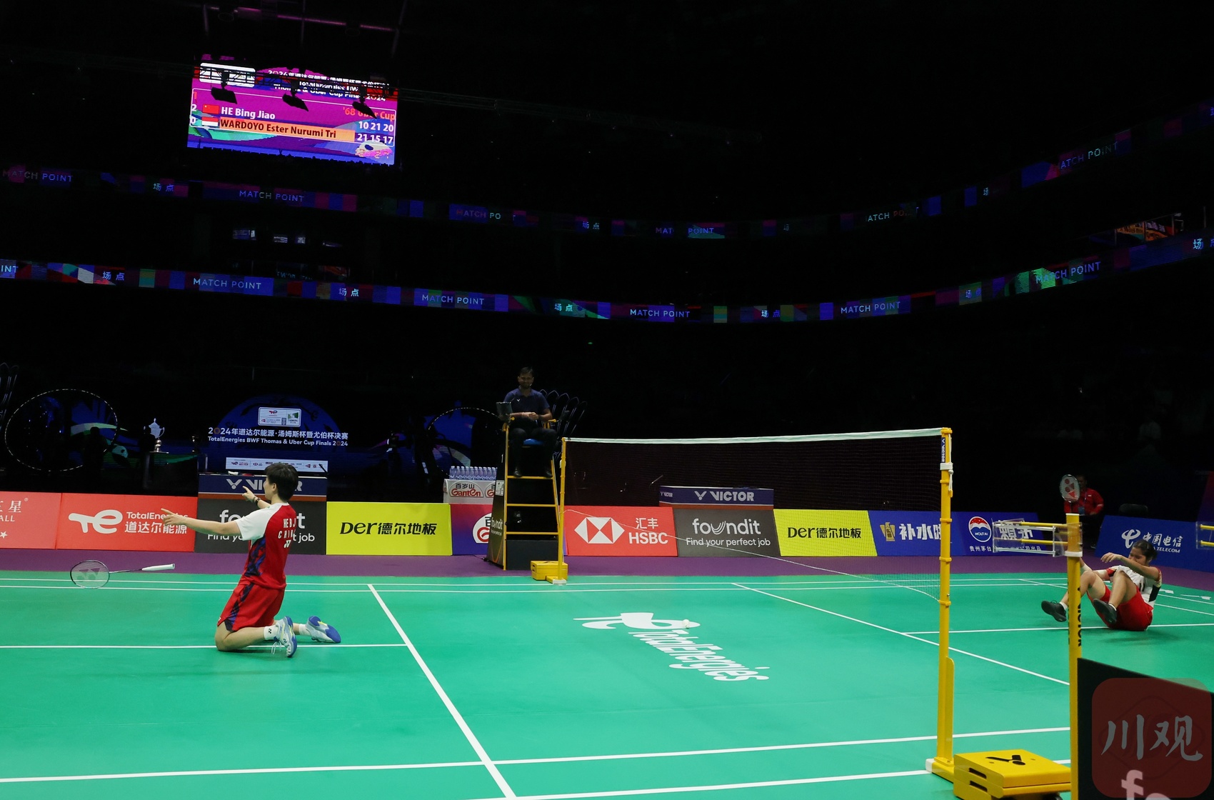 在0∶2落后的局面下,印度尼西亚队在第三场女单比赛中展开了反击。面对中国第二女单何冰娇,世界排名第38位的瓦多约给何冰娇制造了足够多的麻烦,第一局比赛就以21∶10击败了何冰娇。好在何冰娇很快稳住阵脚,以21∶15扳回一城。决战局,双方每分必争,比分交替上升,直到战成14平之后,何冰娇才连得3分,将比分改写为17∶14。而这关键的3分也成为决定本盘比赛的胜负手,最终,手握4个冠军点的何冰娇以21∶17击败对手,帮助中国羽毛球女队以3∶0的大比分击败印度尼西亚队,第16次捧起了尤伯杯。