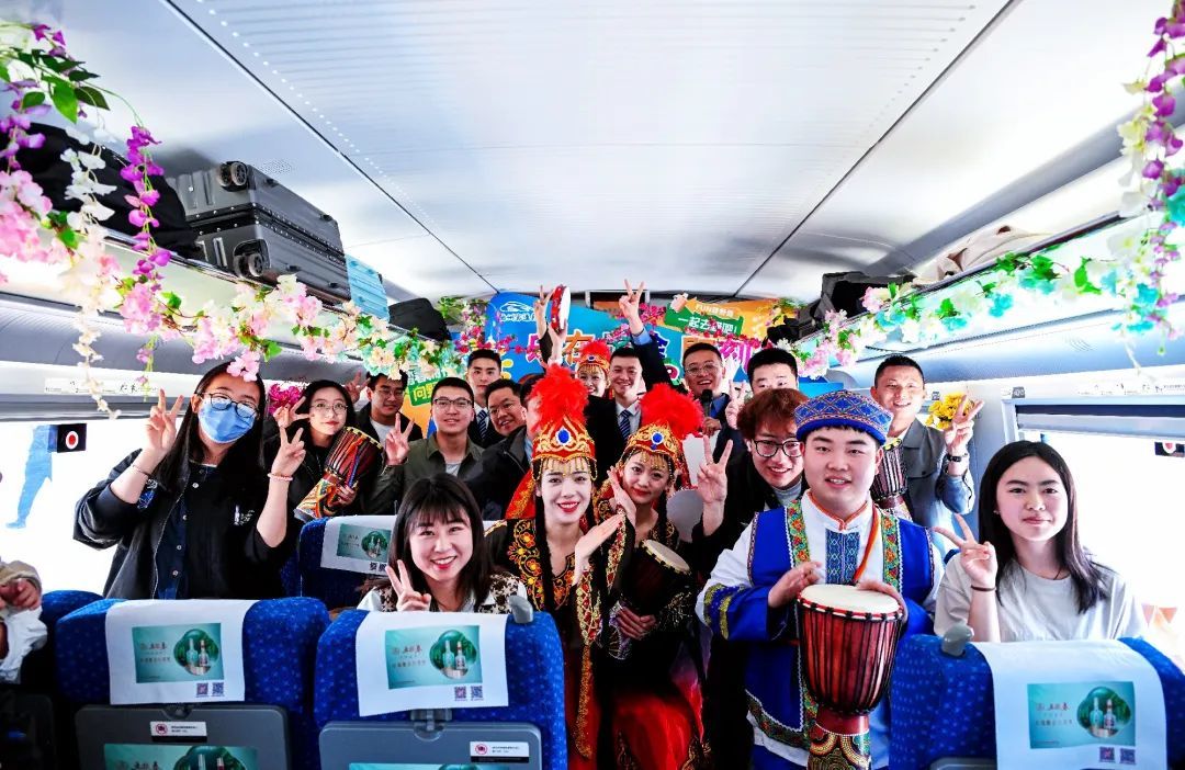 兰州局集团公司在G1876次列车上举办“乐在旅途 即刻出发”主题秀,用锦簇花团装饰列车,乘务员载歌载舞与旅客热情互动,丰富旅客假期出行体验。