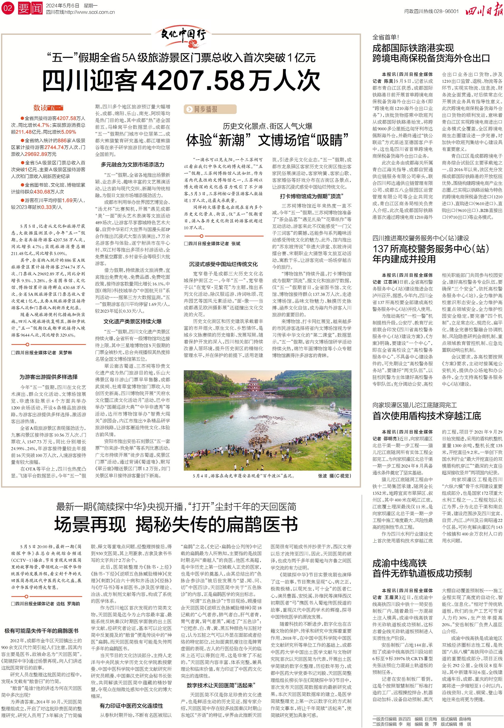 “五一”成绩单出炉:四川共接待游客4207.58万人次,实现旅游消费总额211.48亿元;纳入统计的886家A级景区累计接待游客2744.74万人次、门票收入近3亿元;全省5A级景区门票总收入首次突破1亿元;主要A级景区接待游客人次和门票收入刷新历史纪录;游客在川平均停留1.69天/人,较2023年延长0.33天/人。更多报盘数据,关注今日二版。