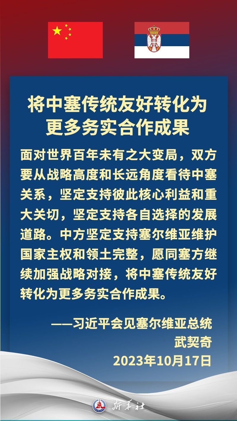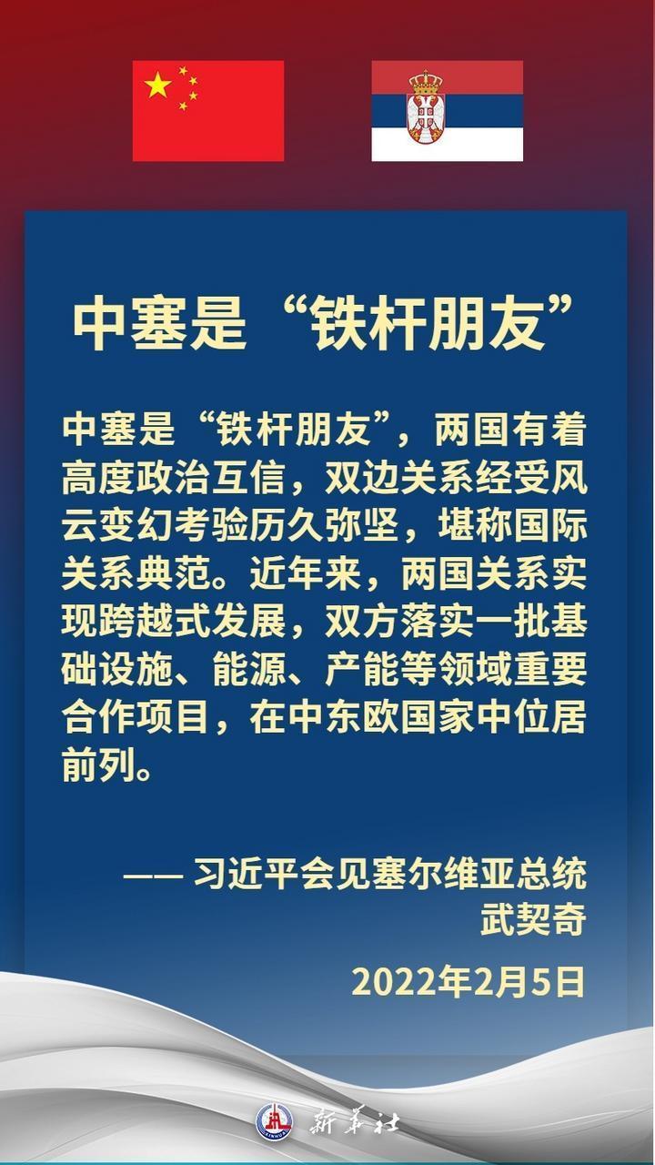 塞尔维亚是中国在中东欧地区首个全面战略伙伴。近年来,在习近平主席和武契奇总统战略引领下,中塞关系保持高水平运行,双方坚定支持彼此核心利益和重大关切,两国政治互信牢固,高质量共建“一带一路”取得丰硕成果,在多边领域协调紧密。习近平主席多次在重要场合提及,中国和塞尔维亚是“铁杆朋友”。