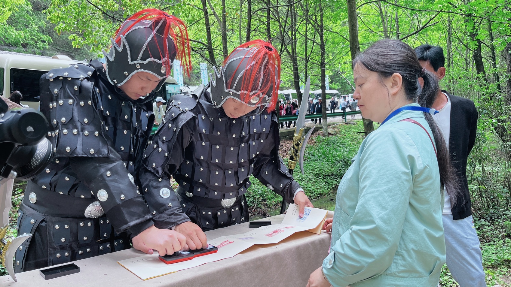 古蜀道游上的“通关文牒”打卡活动,图为游客正在“关卡”处盖通关印章。昭化区委宣传部 供图