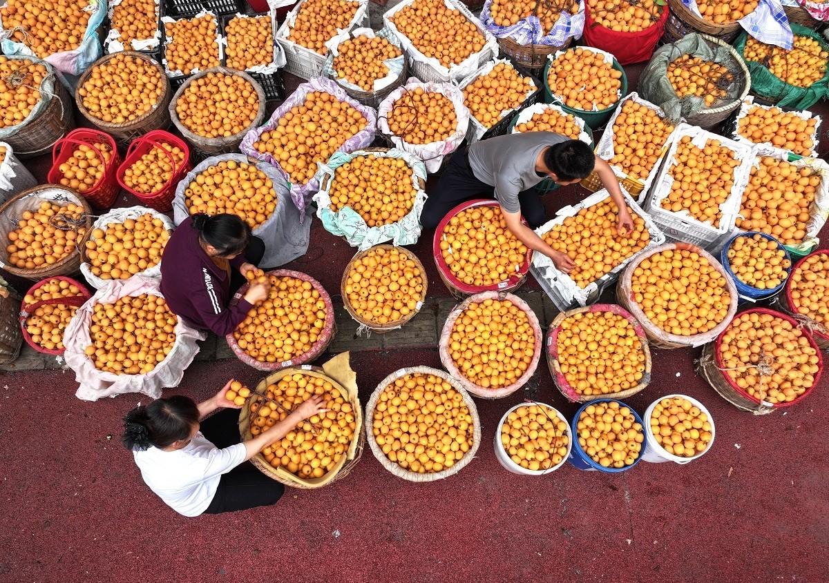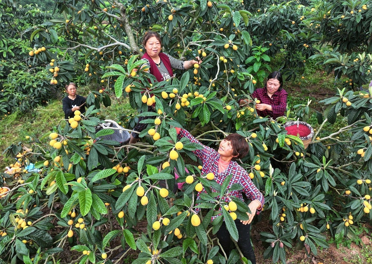 在石家社区山林间的一处果园里,果农徐雪兵正忙着组织当地村民帮忙采摘和打包枇杷。“今天有客商预定了3000斤,我们天还没亮就开始采摘了。”徐雪兵高兴地说,由于今年雨水充足,枇杷产量高、果实大、味道甜,深受消费者喜爱,销量完全不用愁。