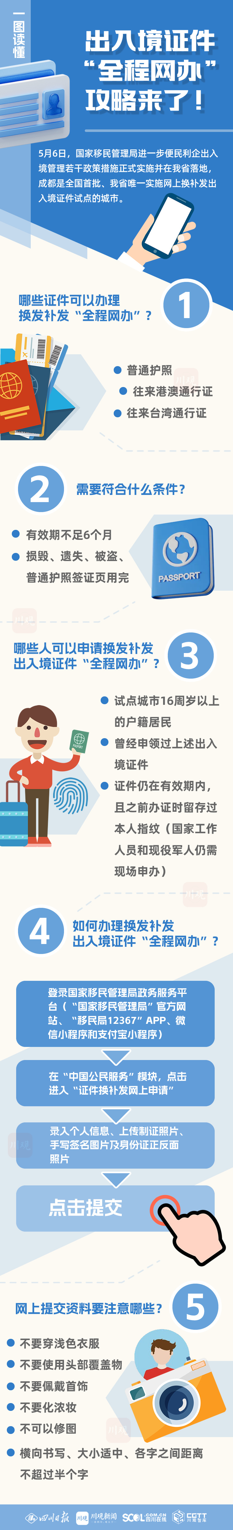 “现在的便民服务越来越好了!”5月6日起,国家移民管理局进一步便民利企出入境管理若干政策措施正式实施并在四川落地,成都是全国首批、四川唯一实施网上换补发出入境证件试点的城市。新政实施当天,来自成都市锦江区的赵女士成为成都市“全程网办”成功受理第一人。