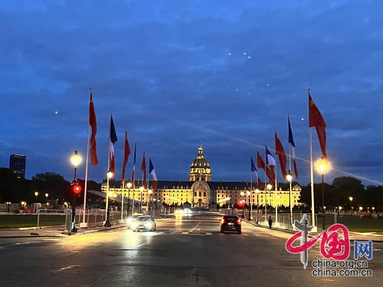 巴黎荣军院门前挂起中法两国国旗。受访者供图