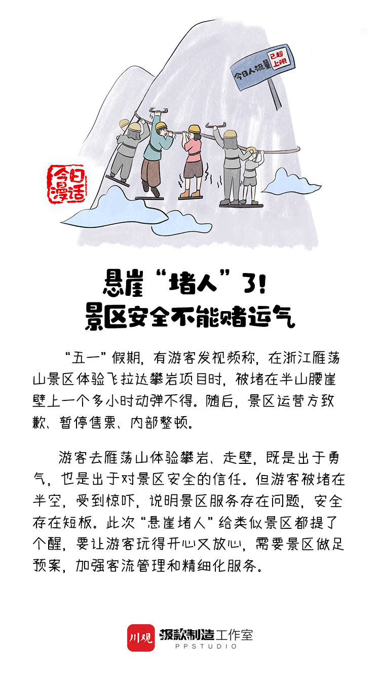 “五一”假期,有游客发视频称,在浙江雁荡山景区体验飞拉达攀岩项目时,被堵在半山腰崖壁上一个多小时动弹不得。随后,景区运营方致歉、暂停售票、内部整顿。对此,你怎么看?