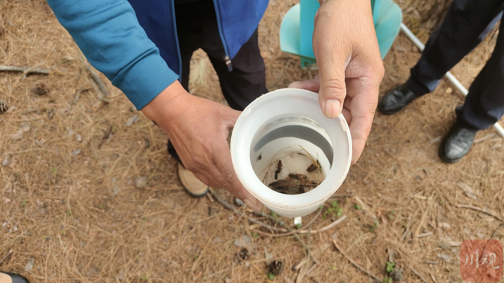 5月6日,凉山州森防站和西昌市林业和草原局副局长唐雷等人来到四合林场,复查这里的防治情况。吉伍尔体每4天从诱捕器中收集一次诱捕到的天牛。经过他的清理,当天共收集天牛10多头。“每40亩有一个诱捕器,诱芯每15天换一次。”