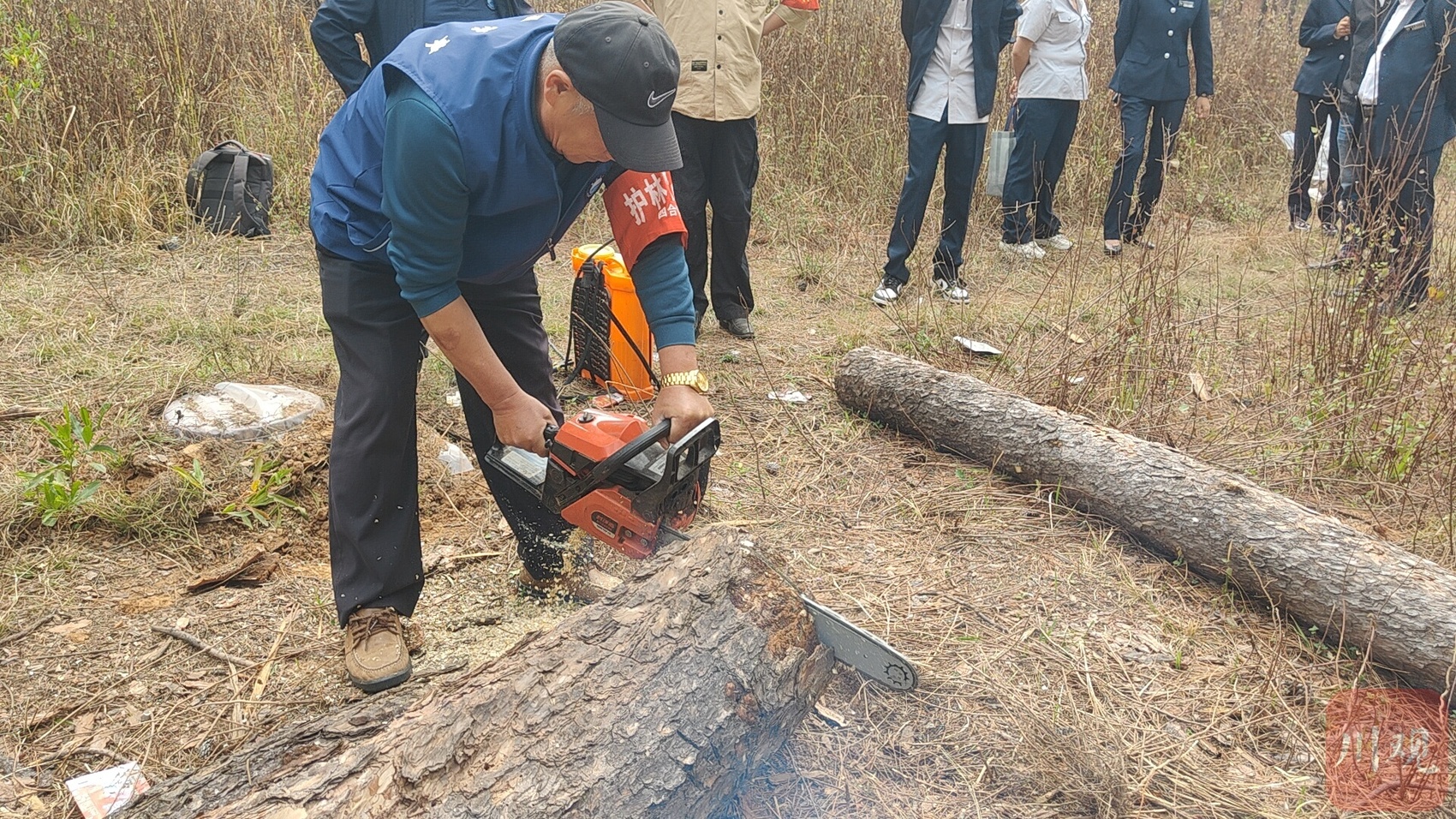 “呜——呜——”随着电锯声响,四合林场的职工将一棵枯死松树伐倒。西昌市林业和草原局的工作人员说,巡查发现枯死松树后要实行即死即清,从树根部分将松树整株伐倒,伐桩需在5厘米以下。松树伐倒后,另一名现场工作人员在伐桩上喷洒杀虫药剂,铺上塑料薄膜覆盖,绑紧后用土将塑料薄膜四周压实。