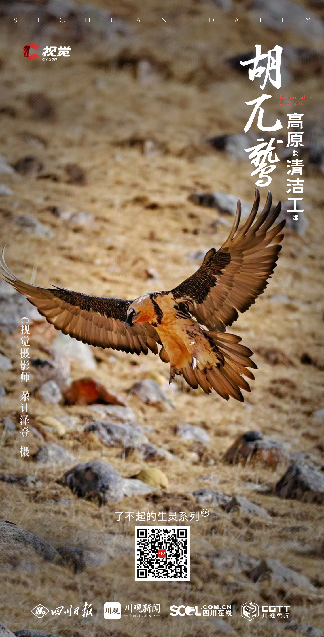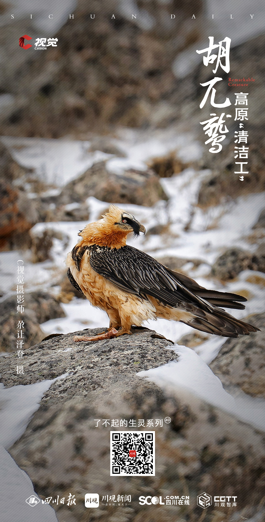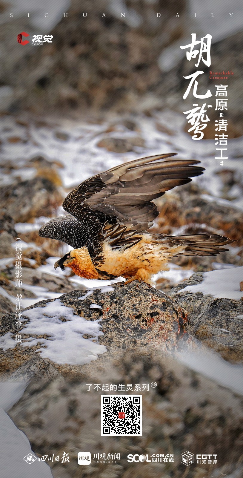 C视觉摄影师尕让泽登自2007年起开始接触摄影,工作与生活在高原的独特环境,使他自始便对这片土地上的珍稀野生动物投以深切的关注与持续的镜头记录。在本期《了不起的生灵》栏目中,他与友人携手分享了一组国家一级保护动物——胡兀鹫的摄影作品,透过镜头背后的故事,带领我们深入了解拍摄高原野生动物的非凡经历。