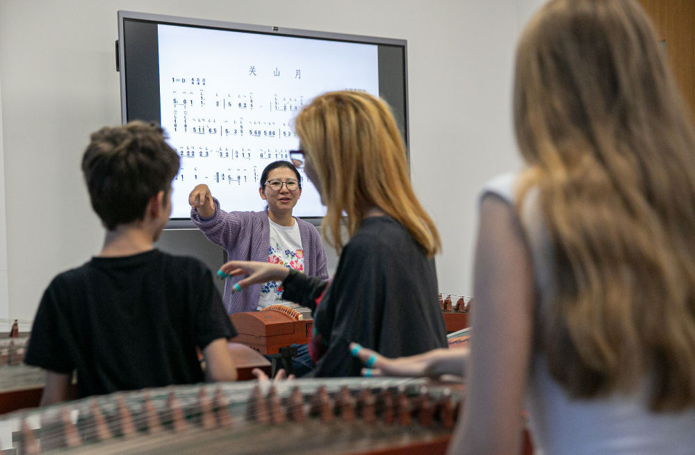 2024年4月29日,在贝尔格莱德中国文化中心,古筝指导老师王宣(后左)在教学。