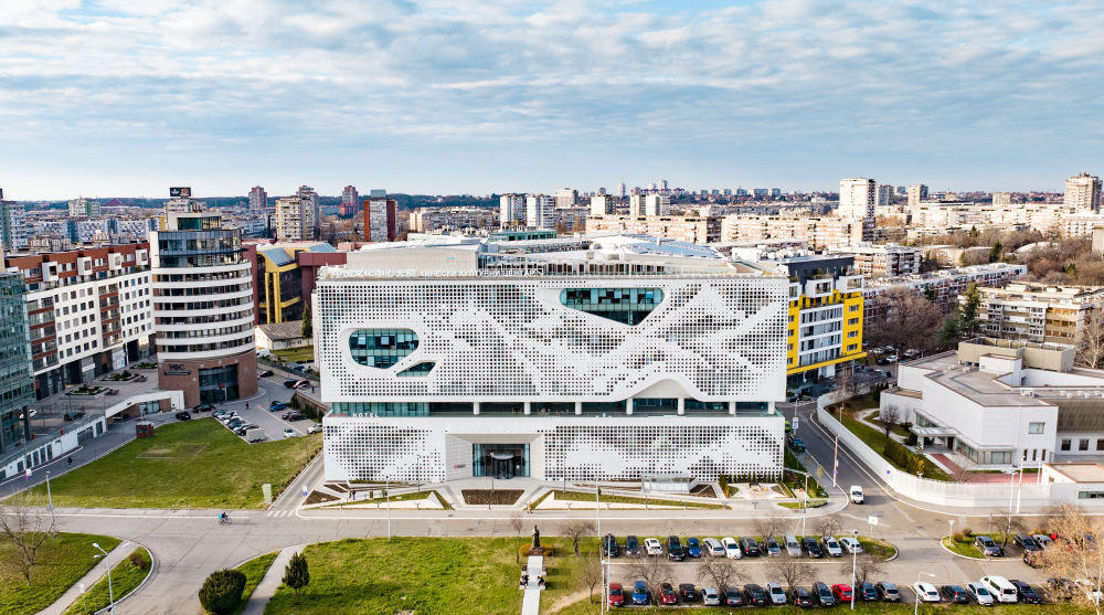 这是2023年12月29日在塞尔维亚首都贝尔格莱德航拍的贝尔格莱德中国文化中心大厦。