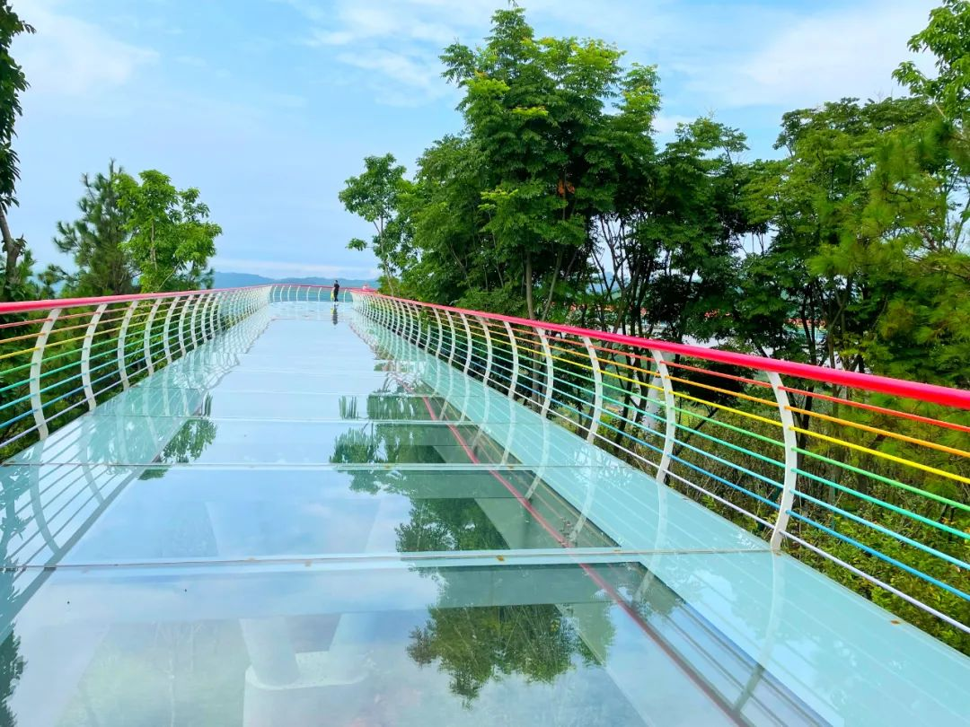丹景台景区玻璃栈道全长近200米,为悬空全玻璃U形栈道,漫步其中,可以同时将森林、坡地、三岔湖尽收眼底。目前,玻璃栈道凭世园会主会场三日内有效门票即可免费进入(为保障游客朋友出行安全,如遇极端天气,玻璃栈道将暂停兑换)。