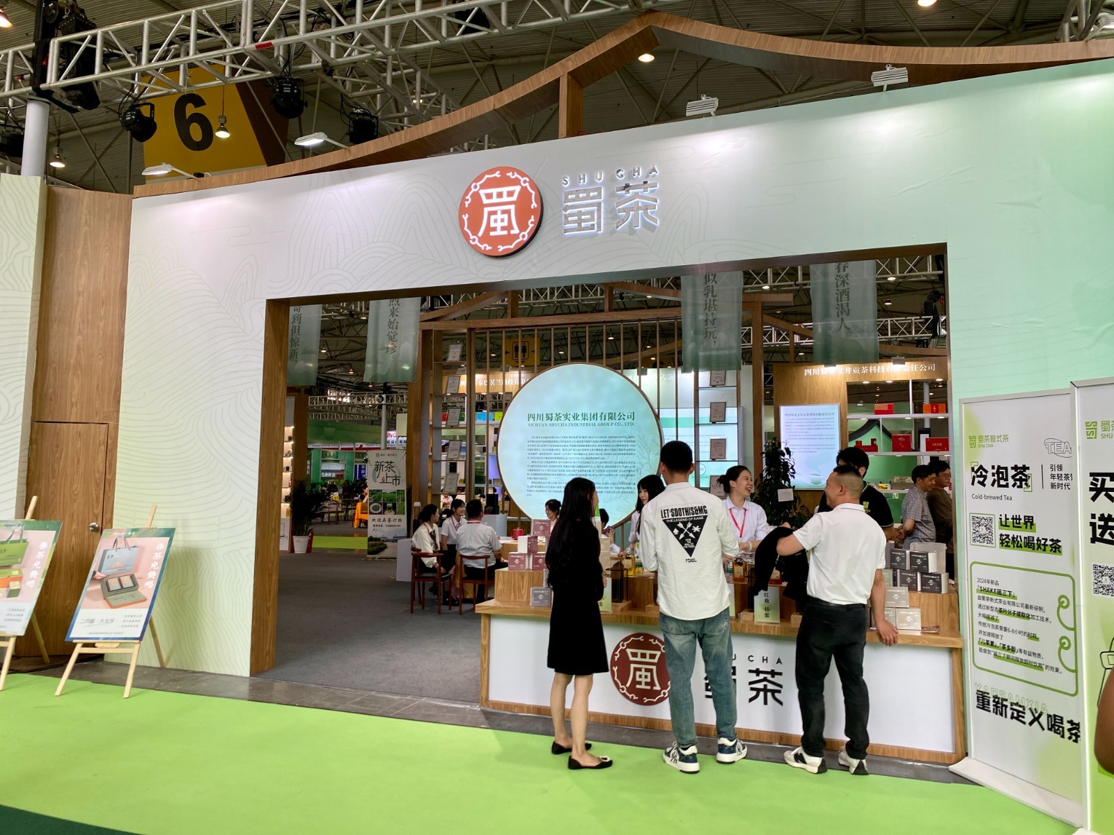 蜀茶集团为省供销社茶企,图为观众正在品尝其新式茶饮。