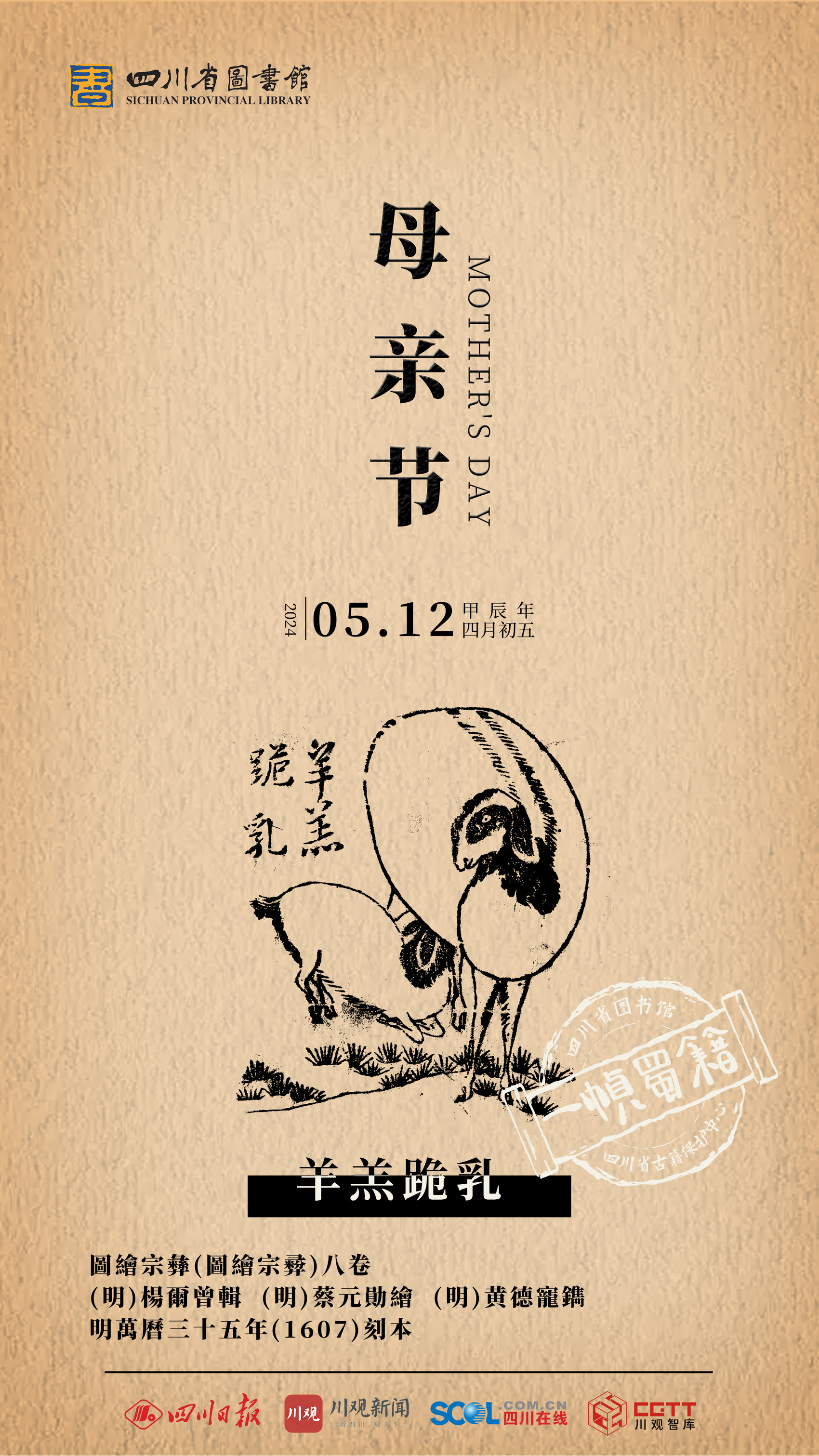 5月12日,母亲节,今天您对母亲表达爱意了吗?一帧蜀籍今日选用图为羊羔跪乳。该图源于图绘宗彝(图绘宗彝)八卷 (明)杨尔曾辑 (明)黄德宠刻 明万历三十五年(1607)刻本(有图 ,卷一、卷三有抄补) 。