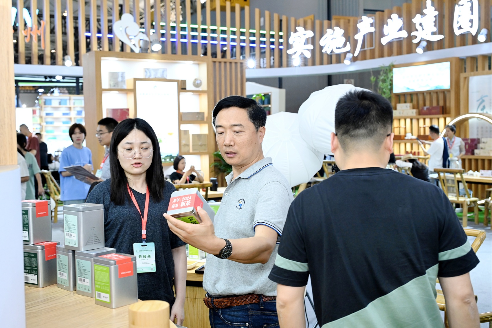 茶博会上,观众对茶叶品牌表现出兴趣。