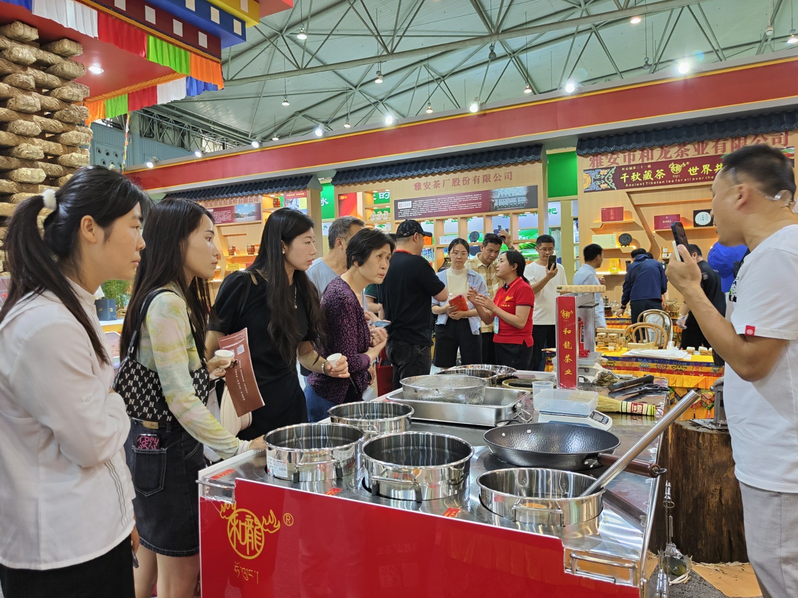 在雅安馆,雅安市和龙茶业有限公司的展位被观众围得水泄不通。工作人员正在演示南路边茶非遗制作工艺,历年来的茶博会上,制茶工艺的现场演示,都是观众关注的焦点。与此同时,该公司带来的茶叶新产品,同样吸引了观众们的关注。